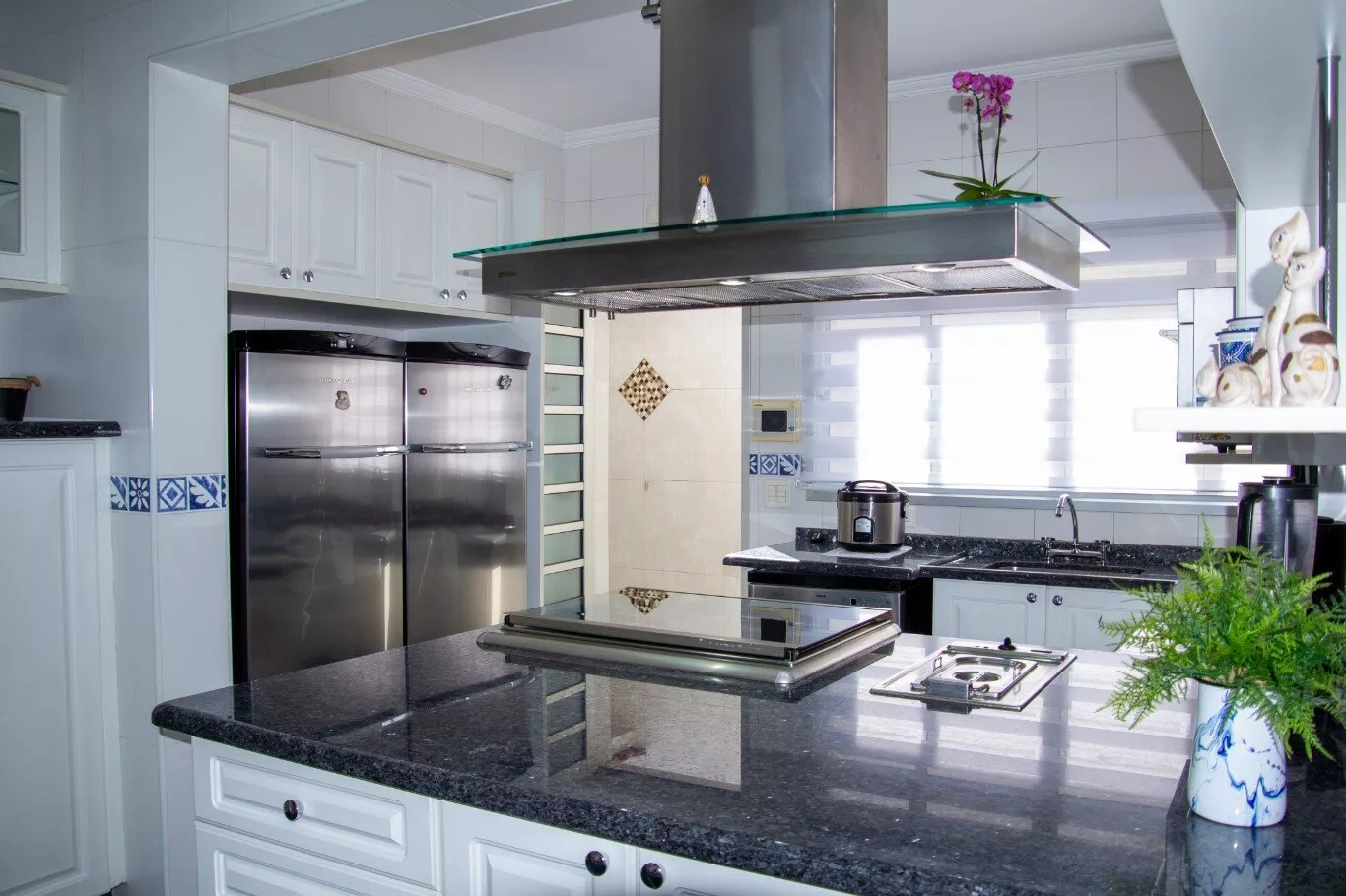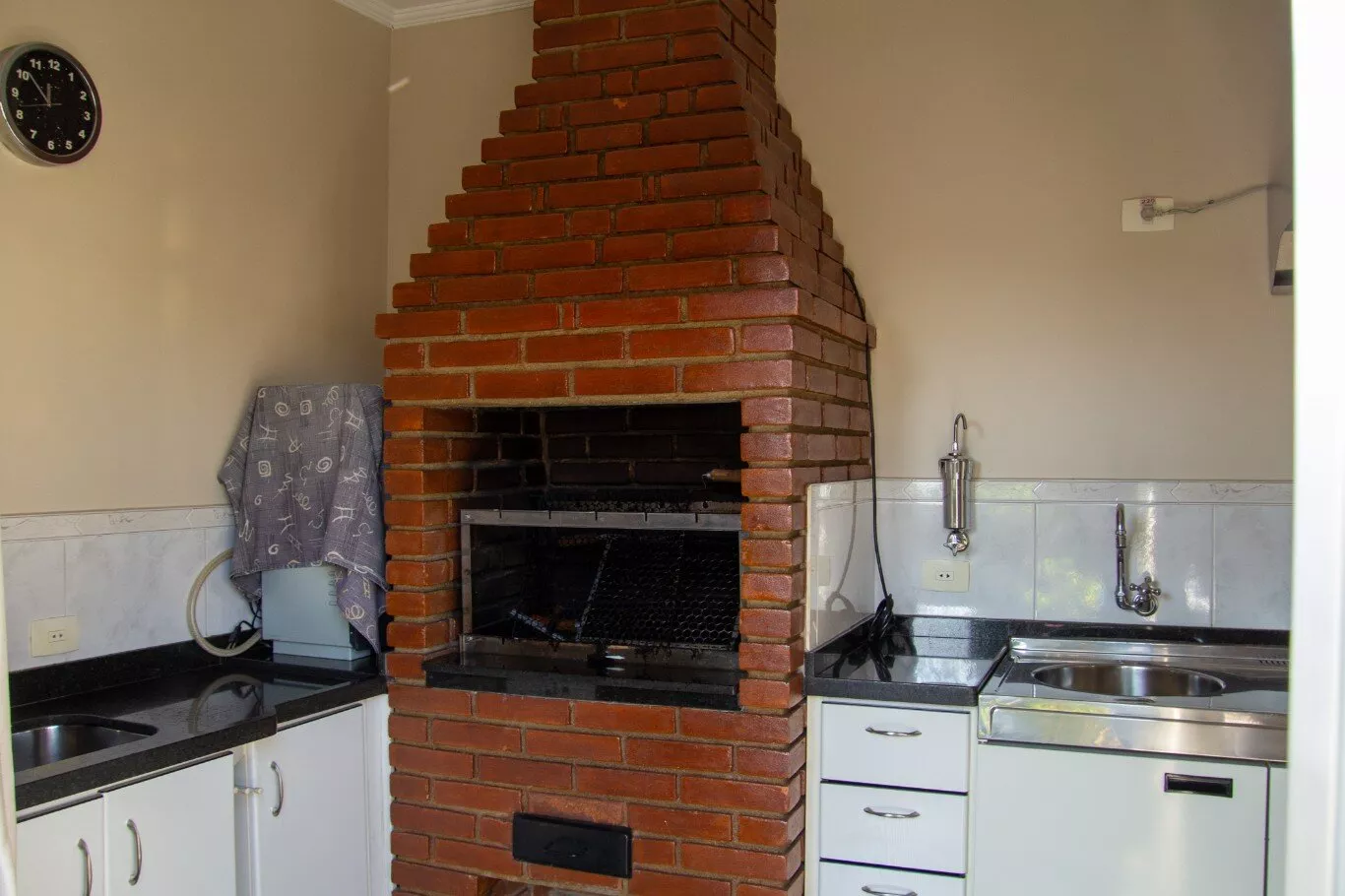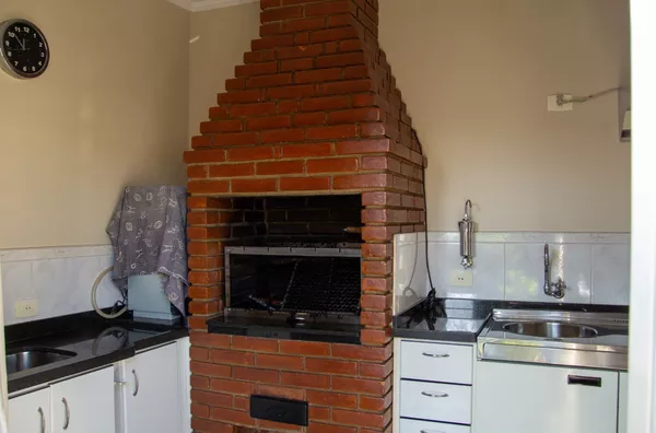 Parte inferior: cozinha gourmet completa com churrasqueira, fogão, geladeira, 2 pias e 01 banheiro