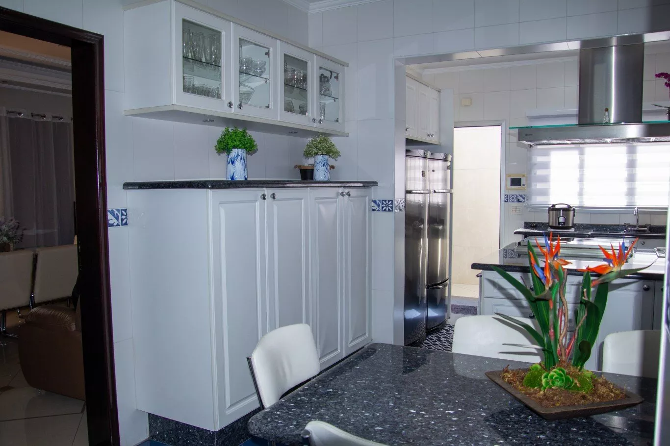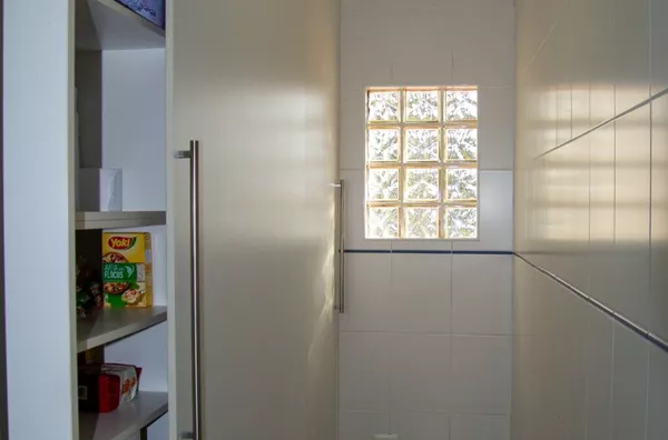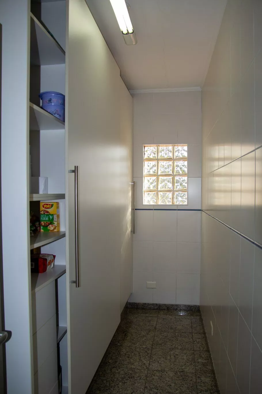 Cozinha planejada com despensa equipada com prateleiras e gavetas